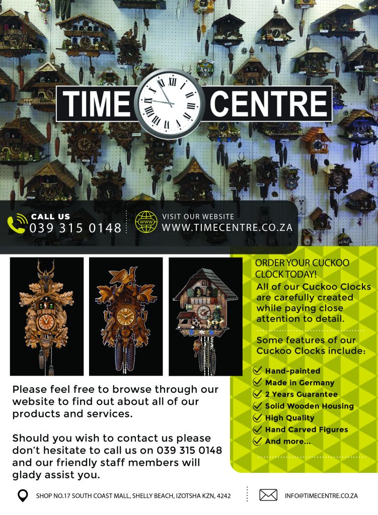 In traditional Cuckoo Clocks, the “coo coo” sound is derived from a system of bellows pushing air through two wooden whistles to recreate the distinctive two-note call of the common cuckoo. The gears of these traditional cuckoo clocks are regulated by a pendulum and system of two or three weights, traditionally shaped like pinecones, that steadily drop over a period of one day or eight days, depending on the model of the clock. A Cuckoo is a beautiful addition to any home, get yours today by viewing our website www.TimeCentre.co.za and place your order.