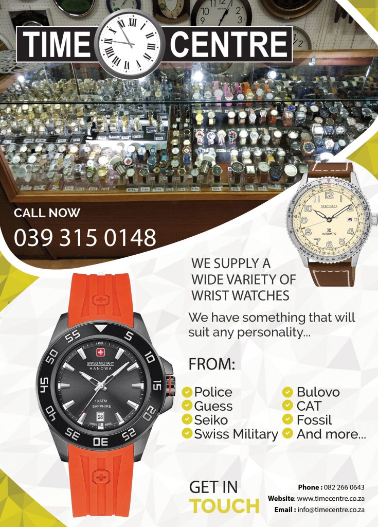 A watch projects an image of who you are, and forms different opinions about the people we meet. The choice gives us a silent clue as to the individuals personality. From Police, CAT, Guess and many more…. We have something that will suit your personality. View our website on www.TimeCentre.co.za or give us a call on 039 315 0148.